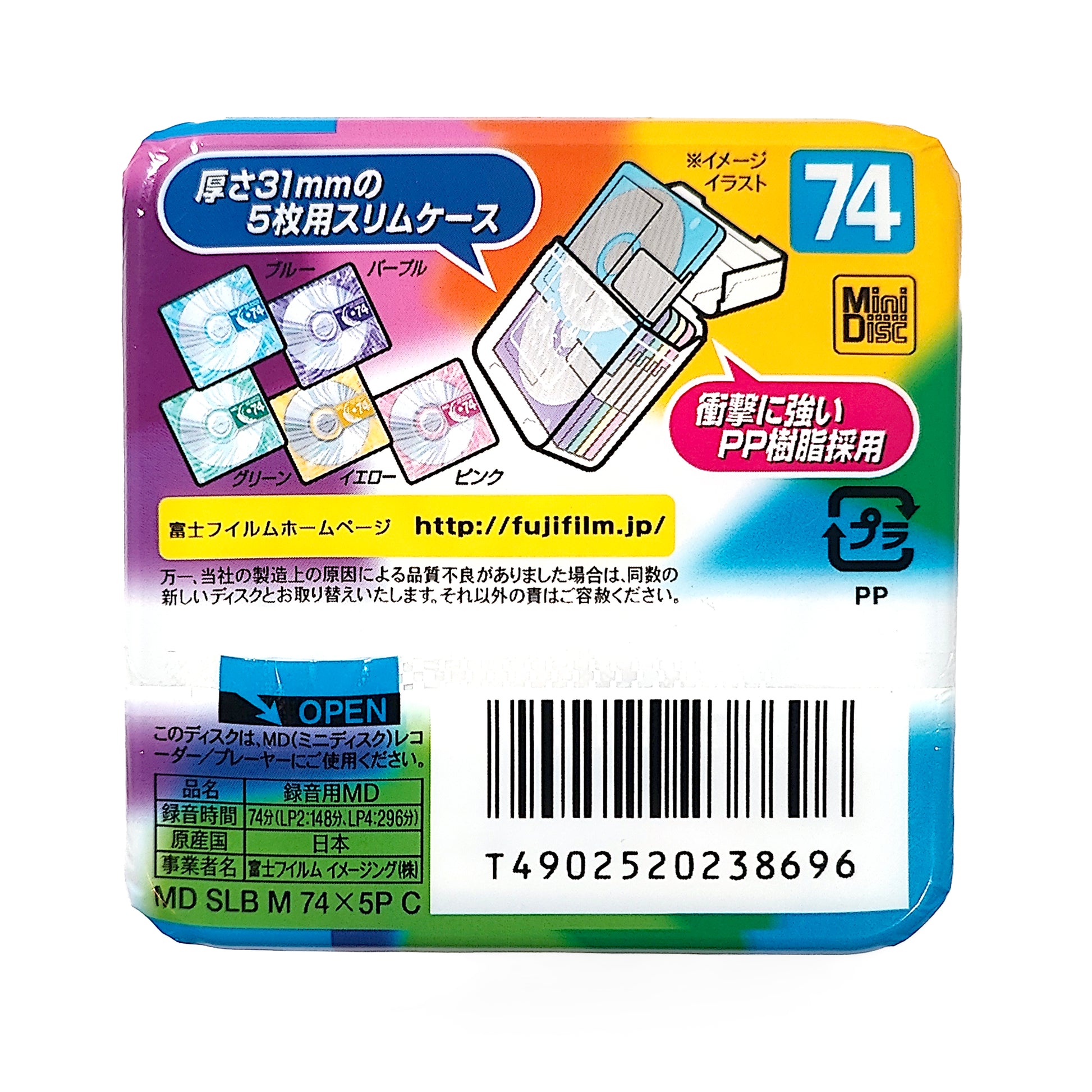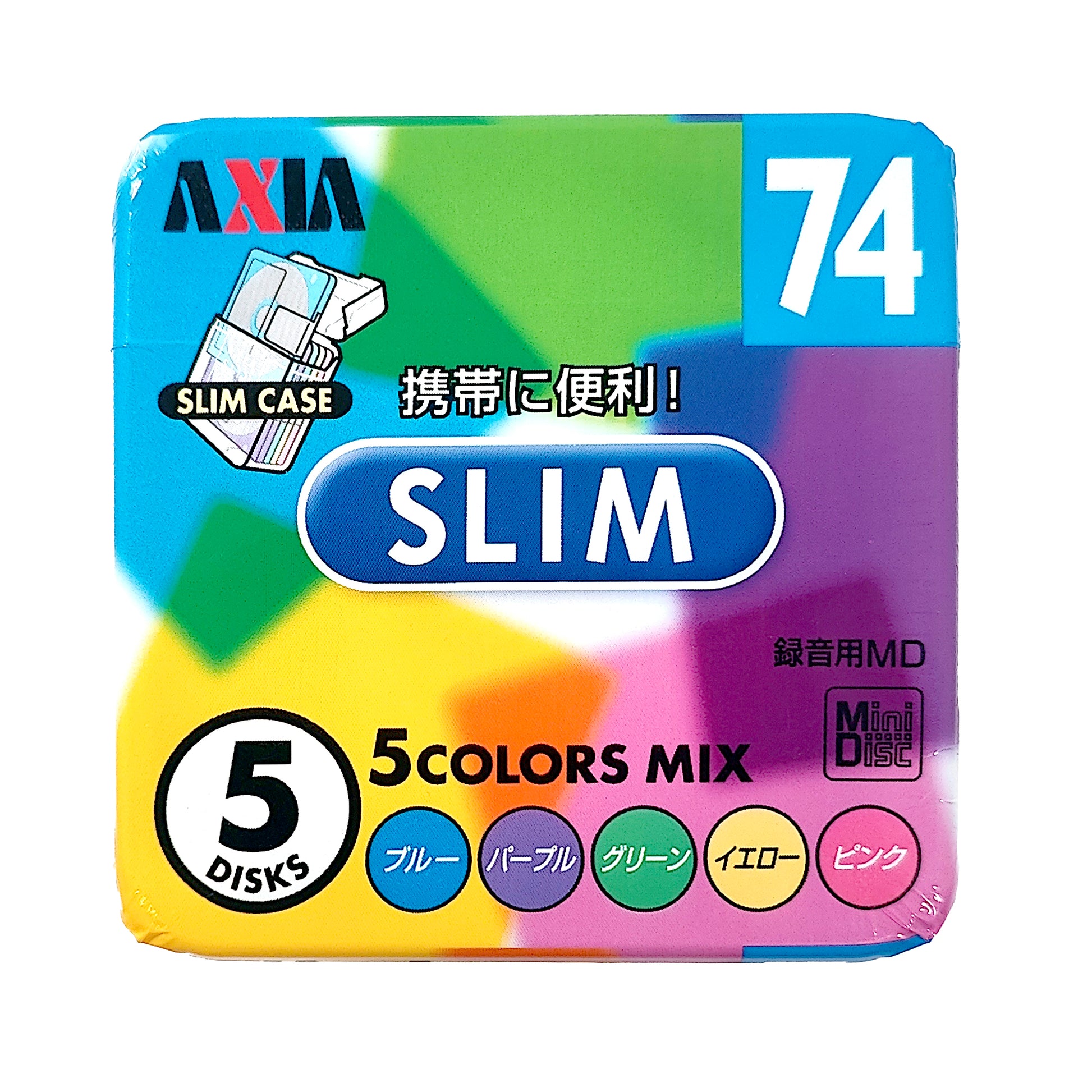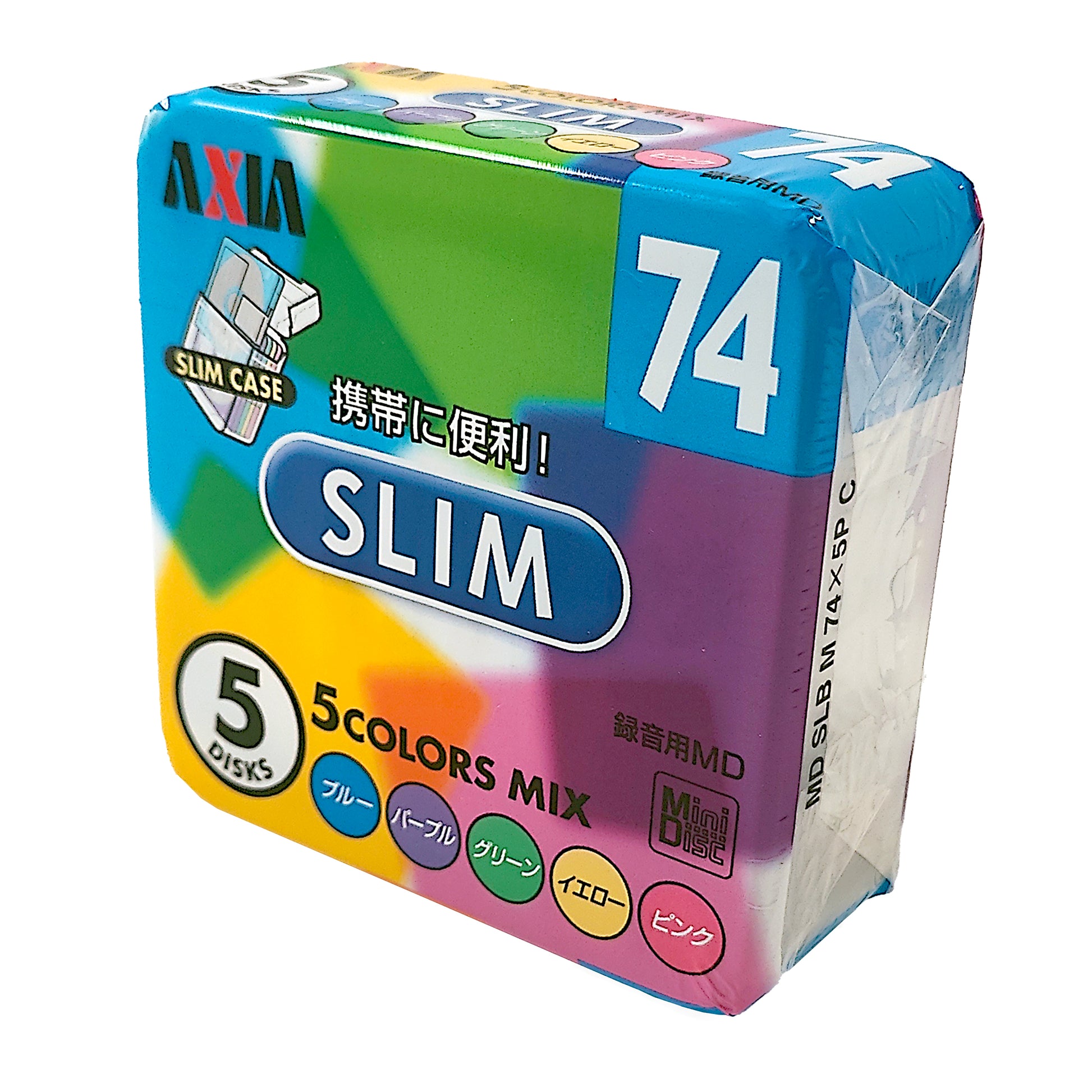 MD SLB M 74X5P C. Genuine AXIA 74 minute recordable MiniDiscs. Five discs. Includes a storage case (SLIM CASE) that holds all five discs. Made in Japan.