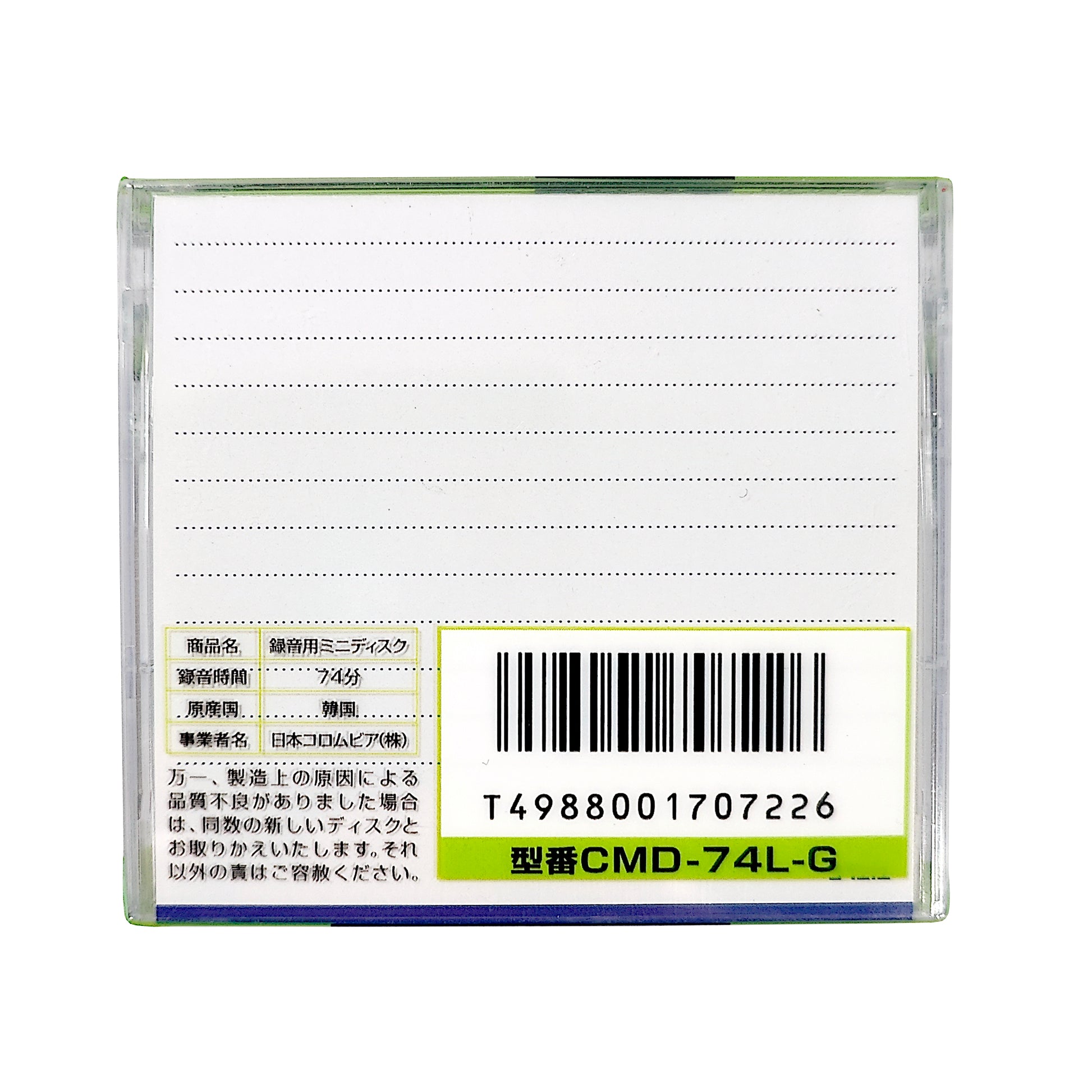 Denon Lapisia 74 minute recordable MiniDisc. Green. Quantity 1. New, factory sealed.