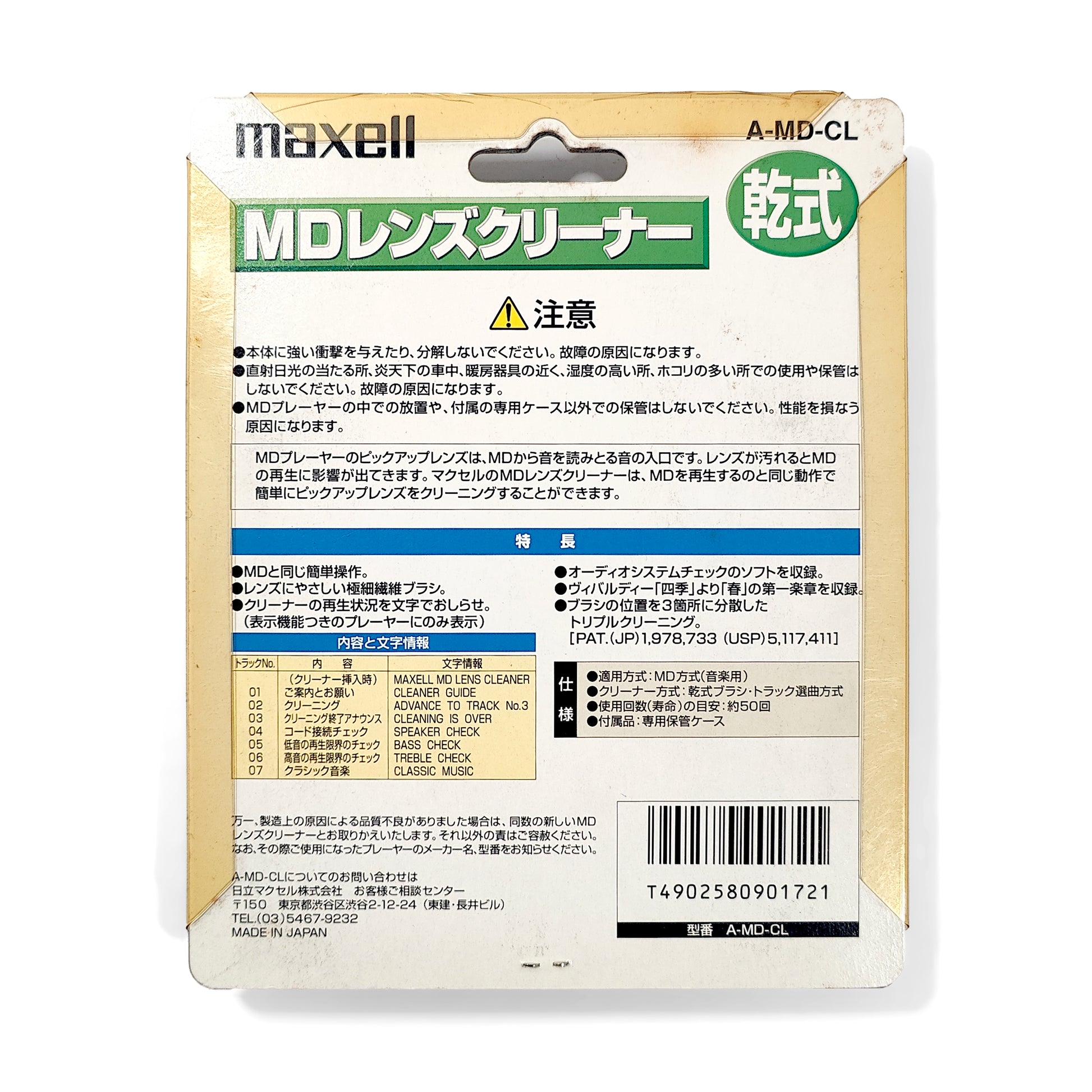 Genuine Maxell MiniDisc player/recorder lens cleaner (Japanese). Dry, brush type. Triple cleaning via three sets of brushes.