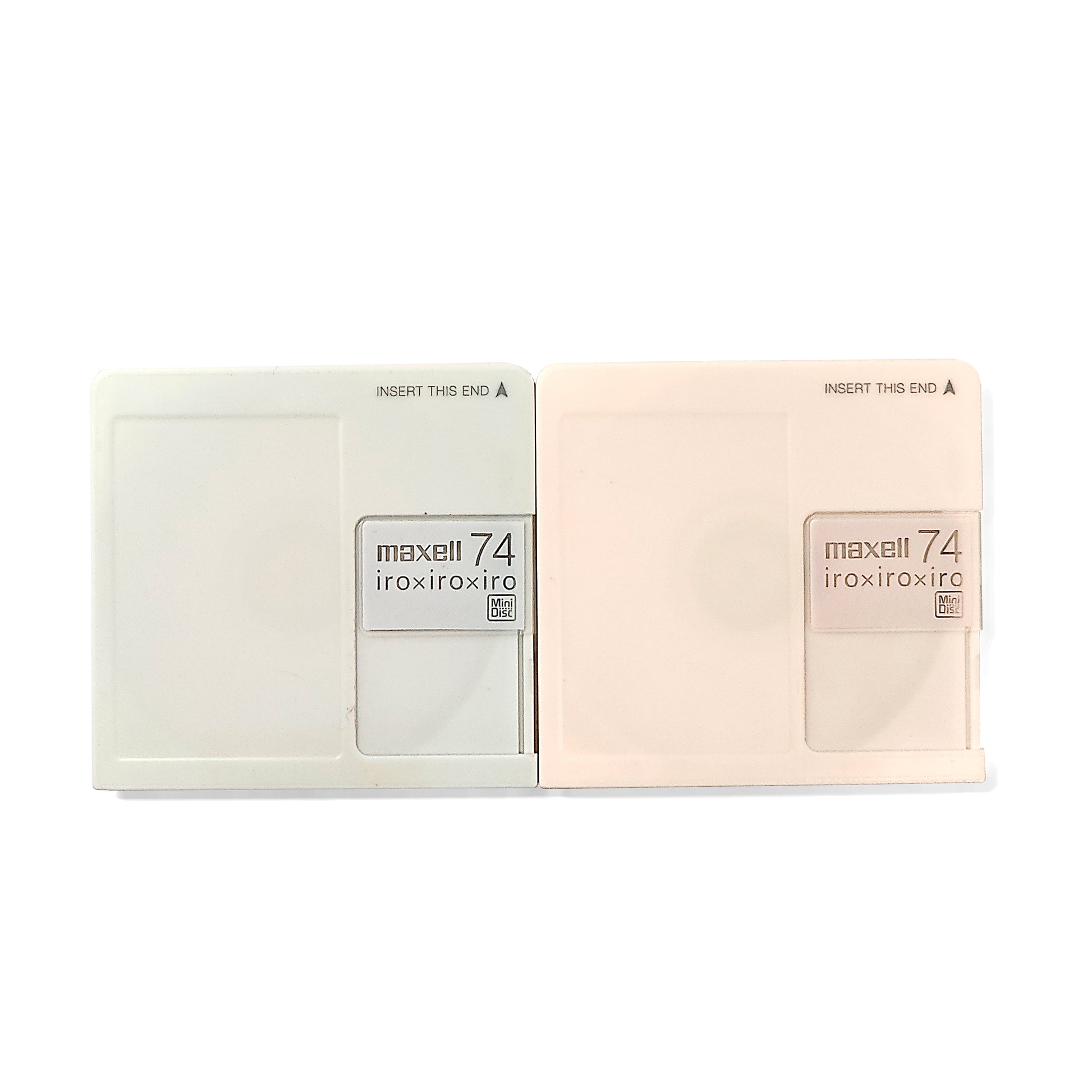 Genuine maxell iroxiroxiro 74 minute recordable MiniDiscs. Made in Japan.