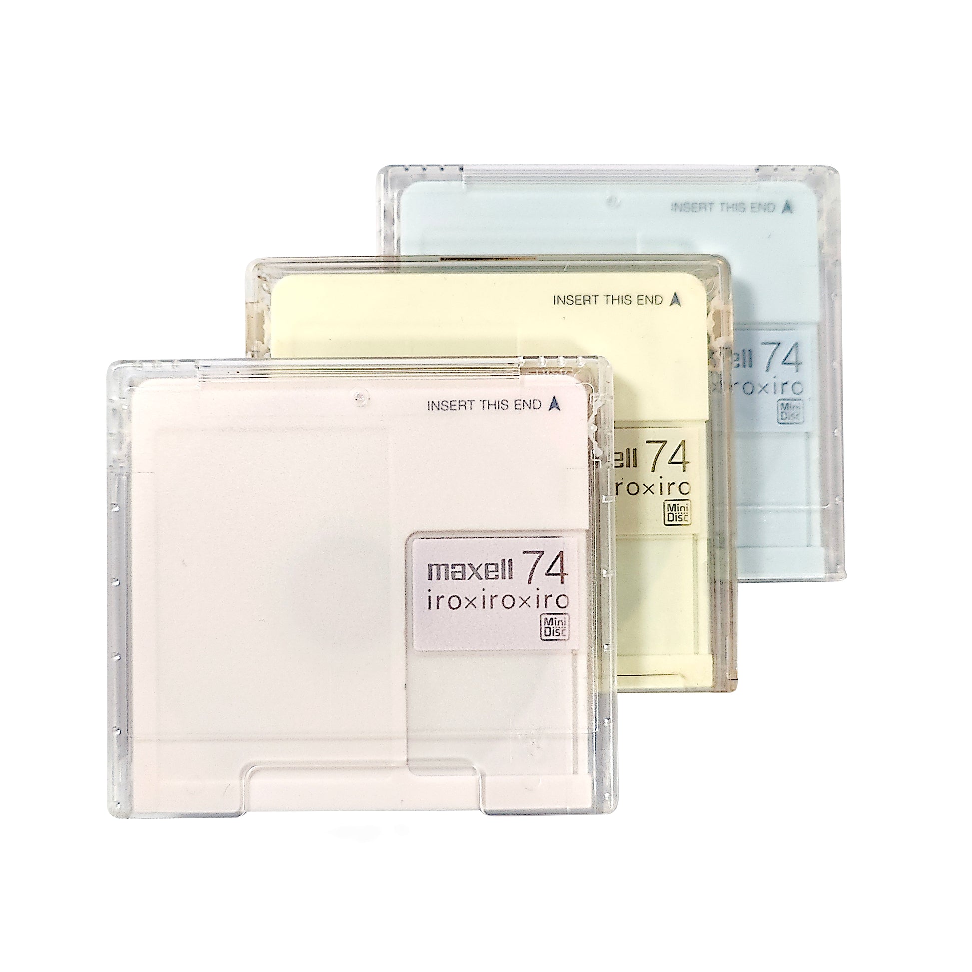 Genuine maxell iroxiroxiro 74 minute recordable MiniDiscs. Made in Japan.