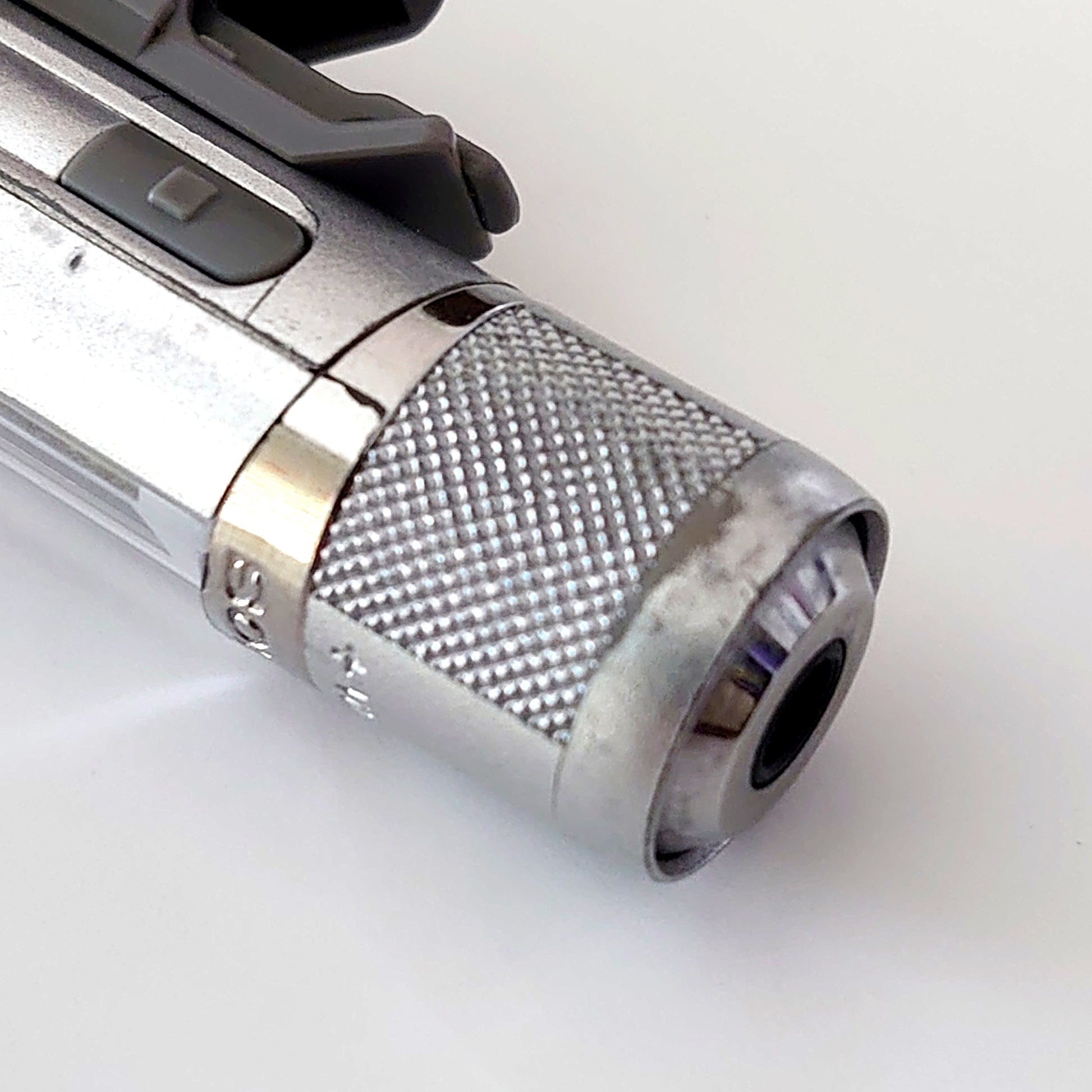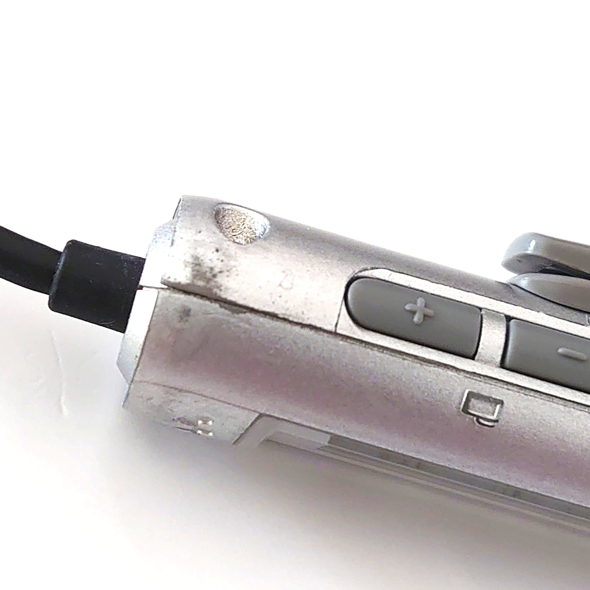There is minor wear and tear around the volume adjustment section and opposite end of the device, where a small part of the silver paint has worn away.