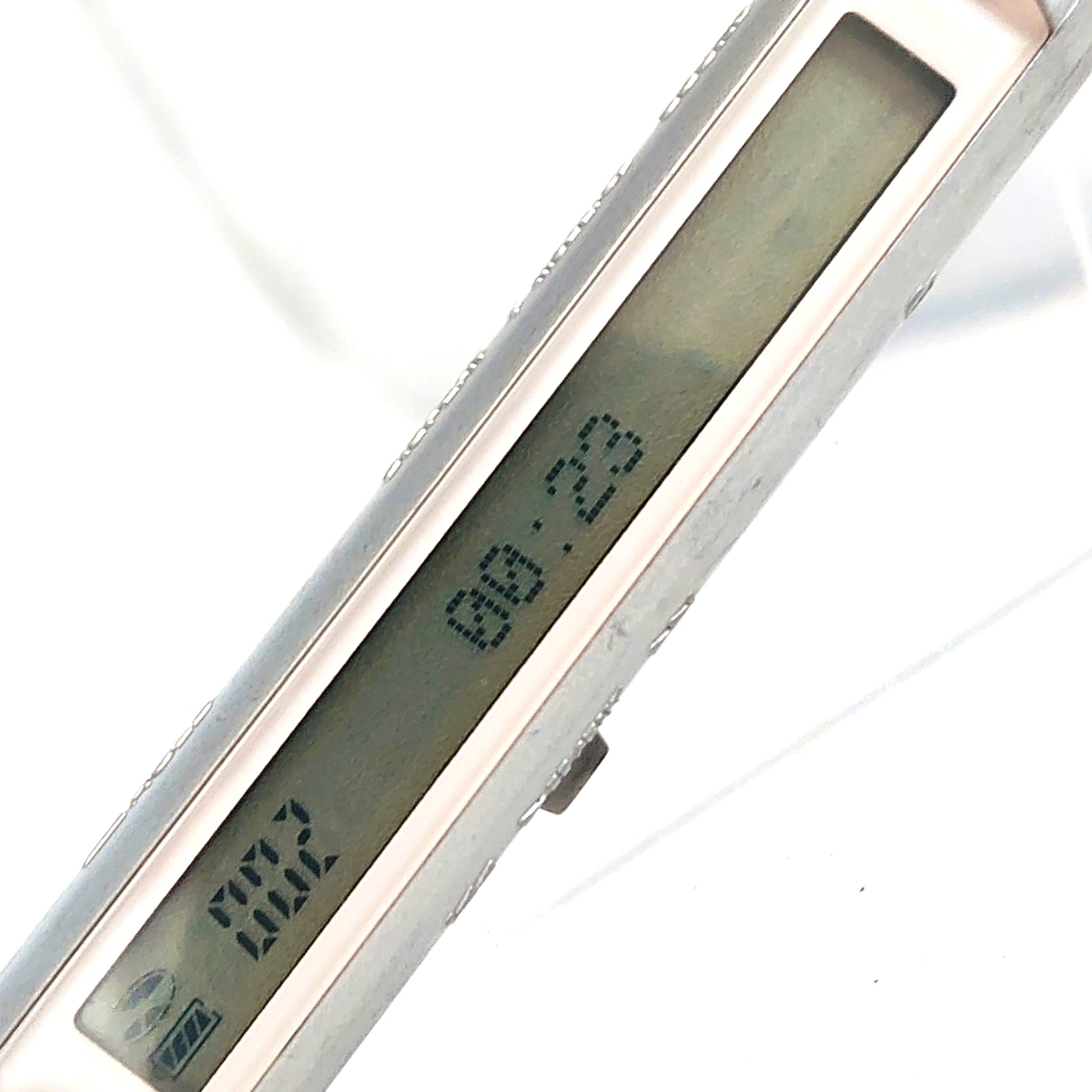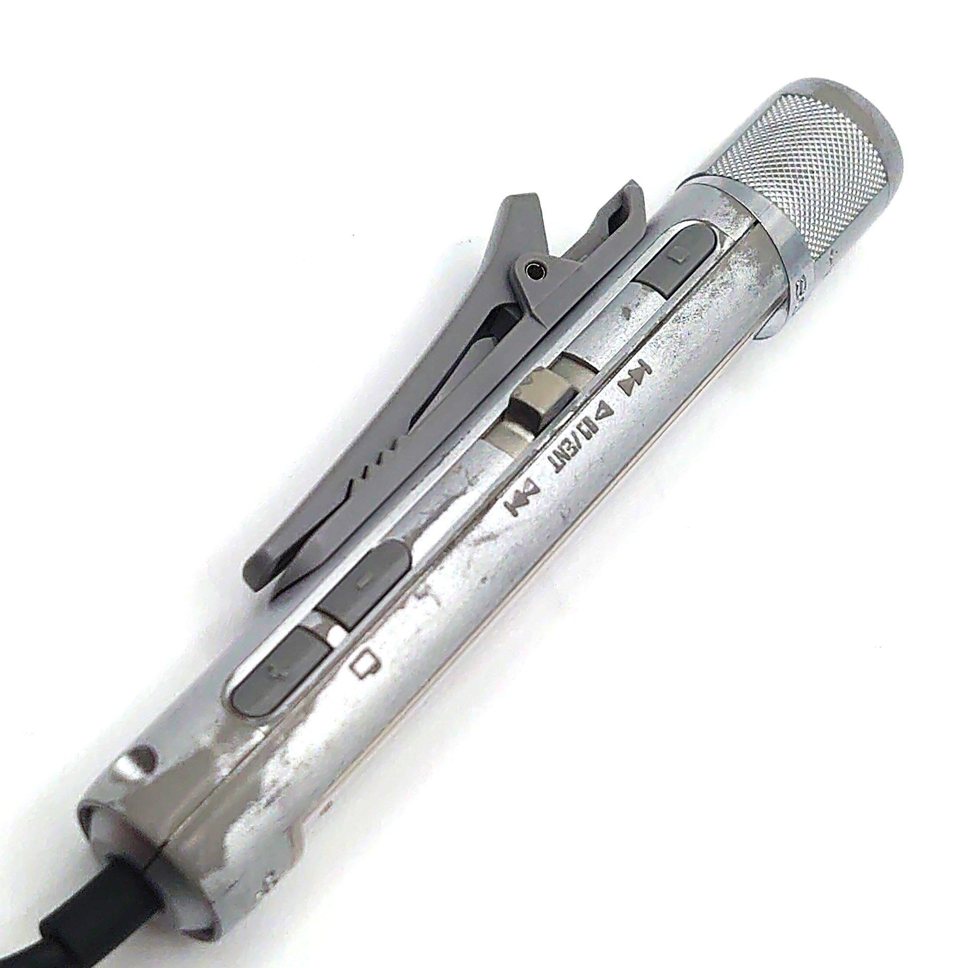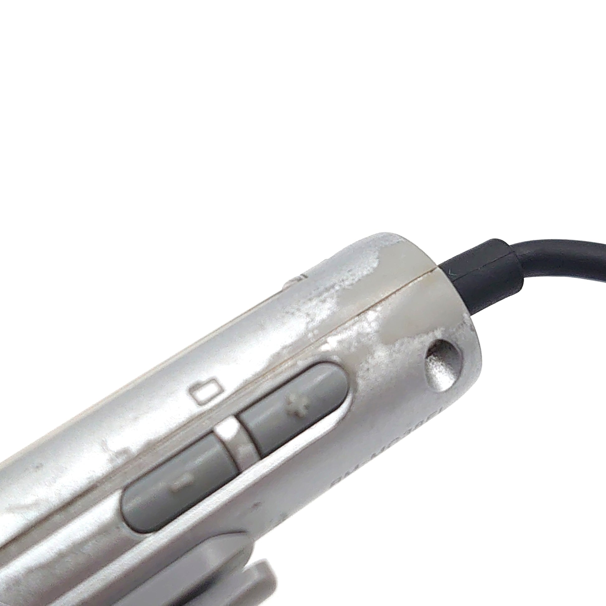 There is a lot of wear and tear on the body of the device where the silver paint has worn away, revealing the grey plastic underneath.