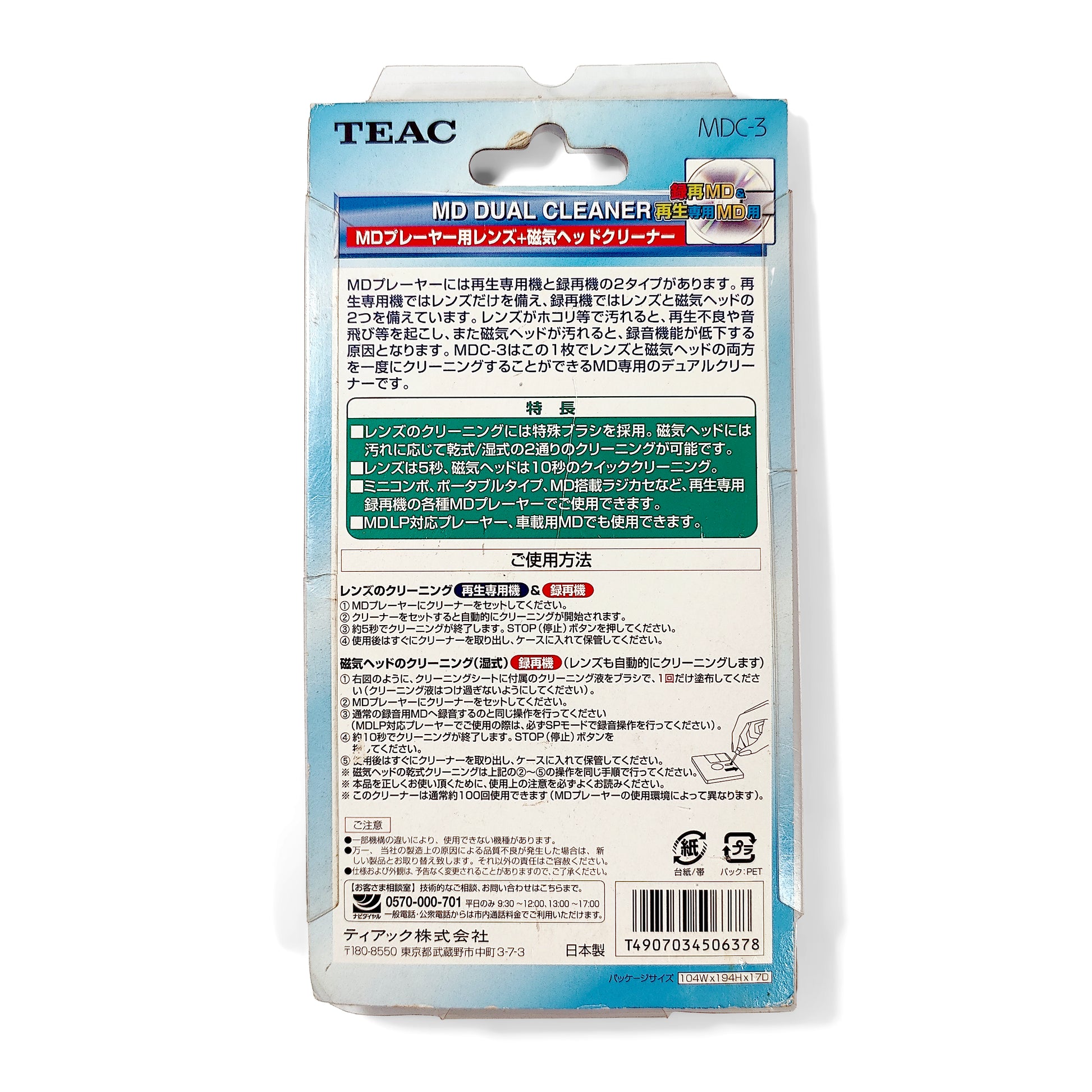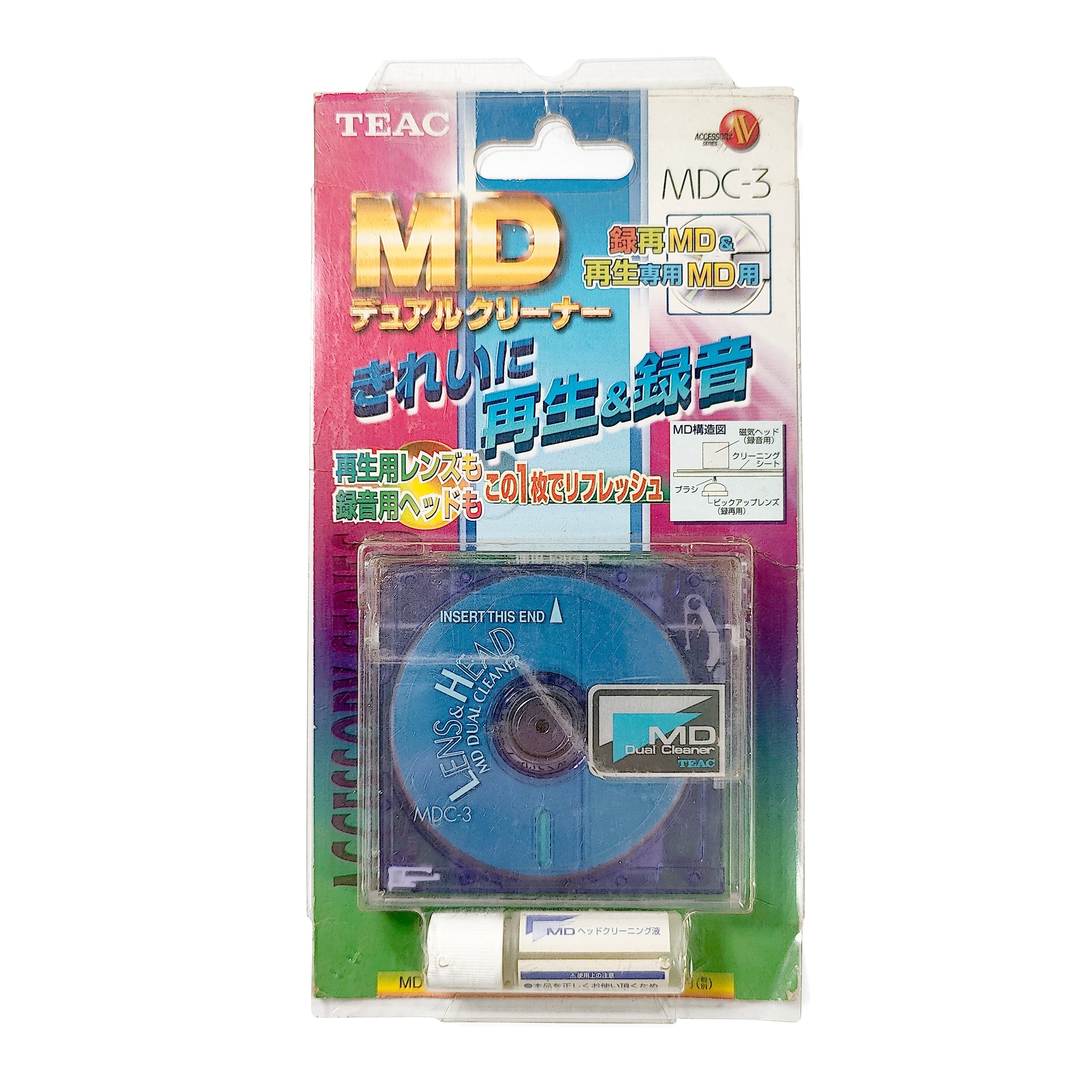 Genuine TEAC MDC-3 MiniDisc Head & Lens Cleaner (Japanese). Dry brush type for lens cleaning, and wet type for recording head cleaning.